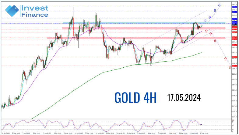 Desde la perspectiva del análisis técnico, observando el gráfico de 4 horas del oro, se puede notar que los precios oscilan dentro de un rango lateral entre los límites de 2277 dólares en el extremo inferior y 2431.3 dólares, que es el máximo histórico. Actualmente, el oro se dirige hacia el límite superior de este rango, dentro de un canal ascendente, intentando superar y consolidarse por encima del importante nivel de resistencia psicológica de los 2400 dólares. Solo después de establecerse sobre este nivel, los inversores podrían apuntar nuevamente al máximo histórico alcanzado el 12 de abril.